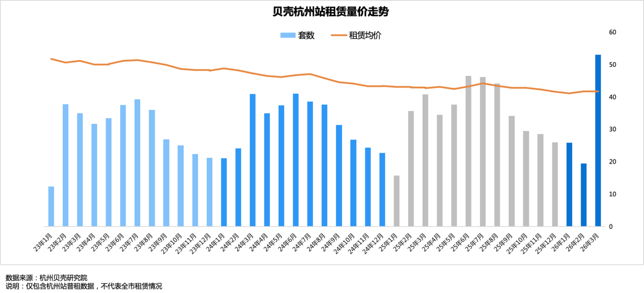 而在杭州,租赁市场同样迎来需求端的强劲爆发。今年春节假期后,贝壳杭州站租赁成交量屡创历史新高。然而,与一线城市“量价齐升”不同,杭州租赁市场目前仍处于“量升价跌”的状态,不过租金同比跌幅收窄,有企稳迹象。