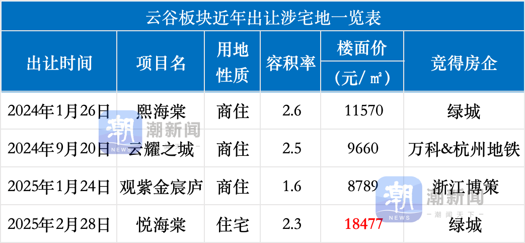 从2024年开始,云谷板块保持着每年两宗涉宅地的出让节奏。绿城在此拿地最多,已接连开发了熙海棠、悦海棠两个项目,其中,2025年2月拿地的悦海棠(楼面价18477元/㎡)是板块地价纪录保持者。